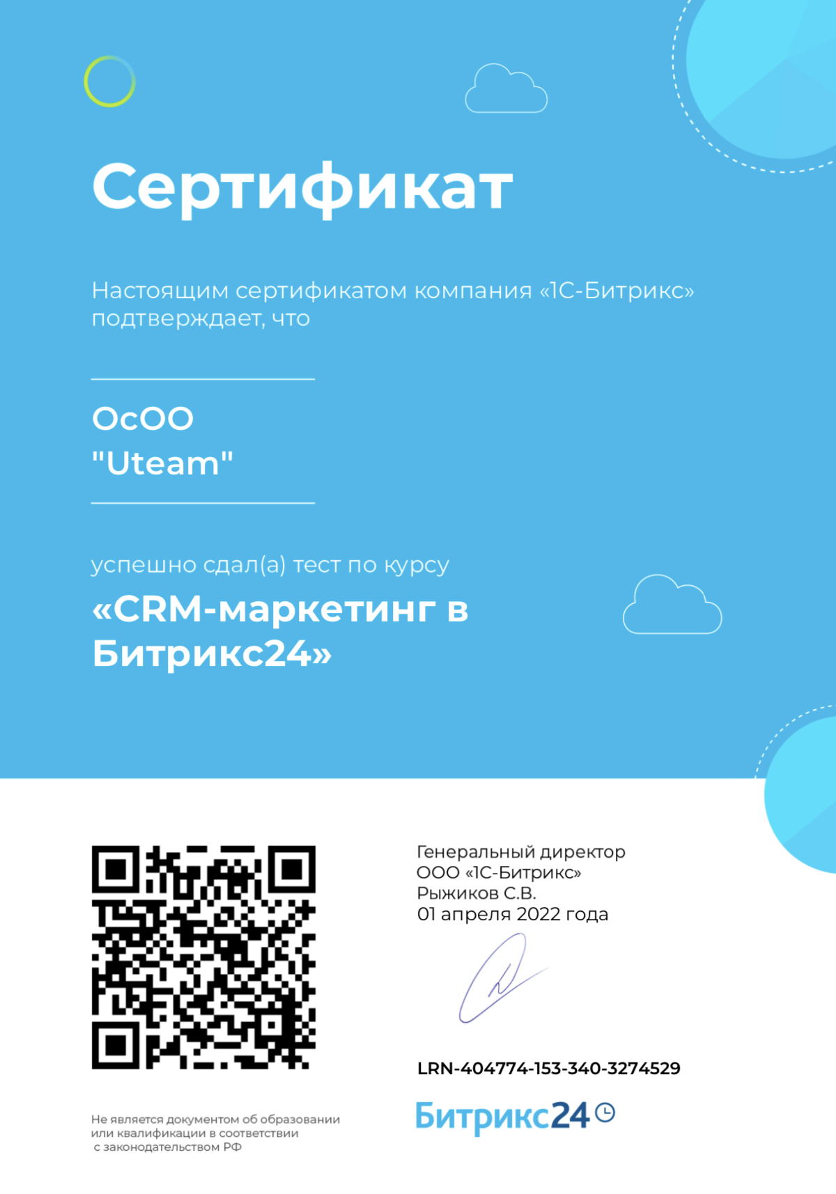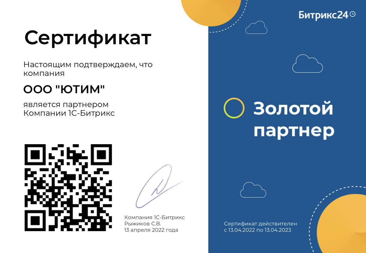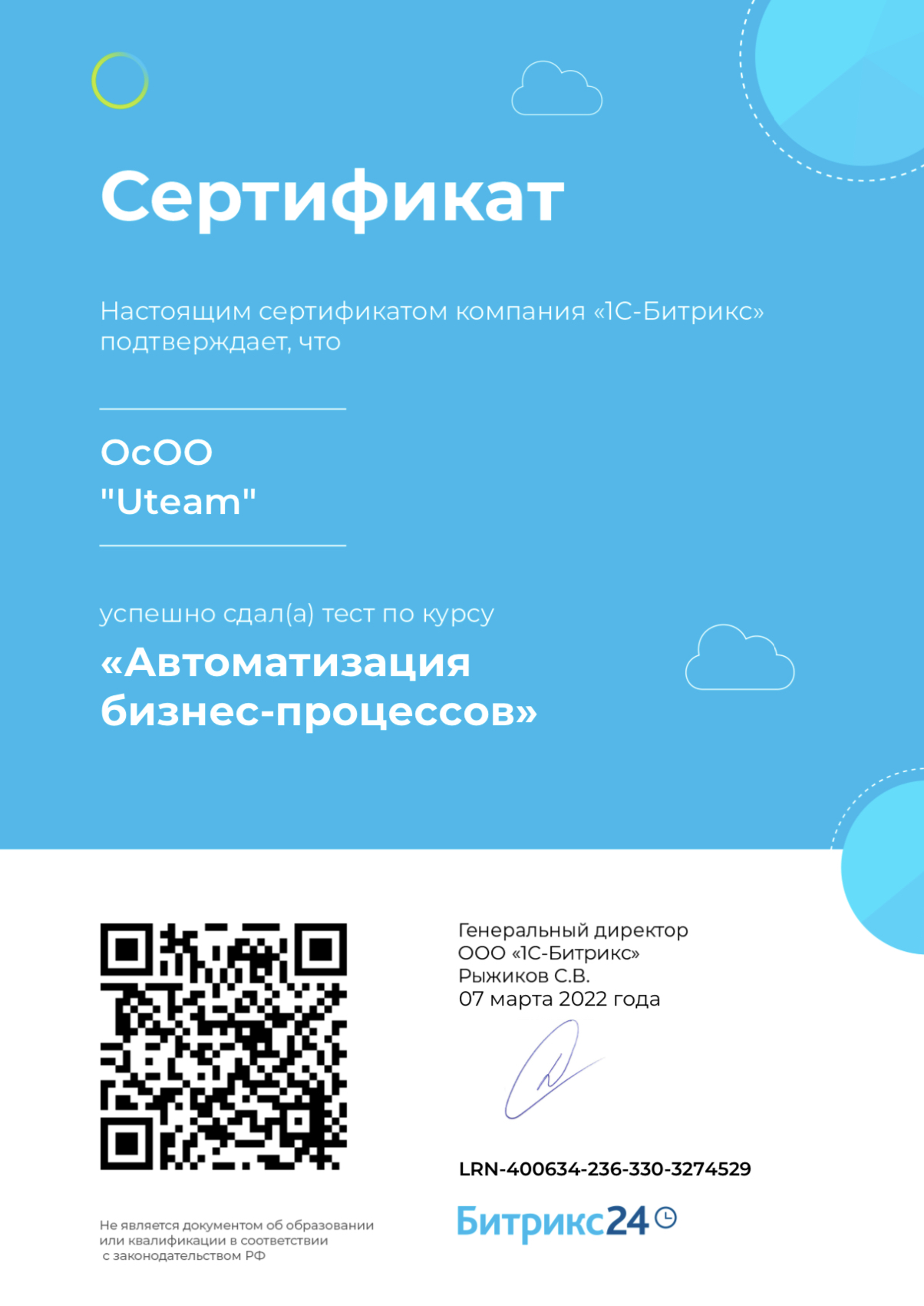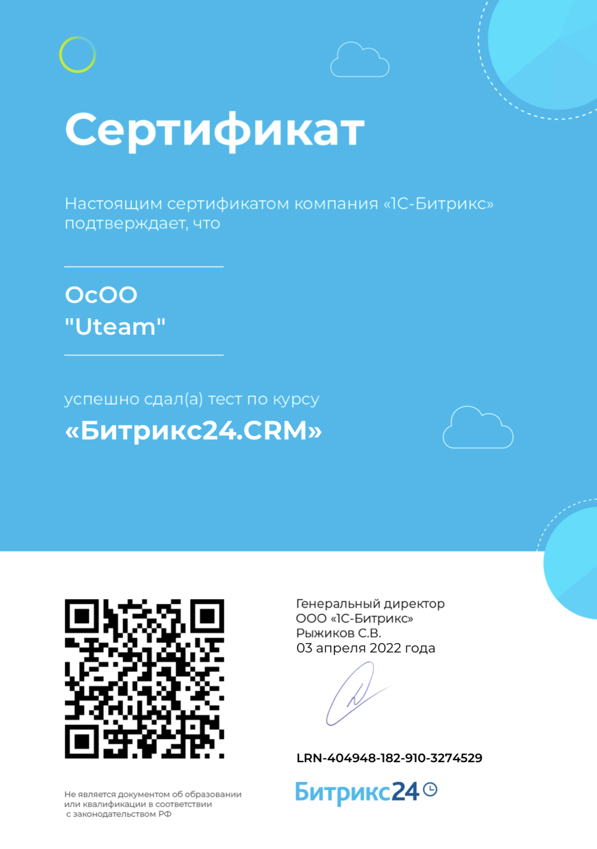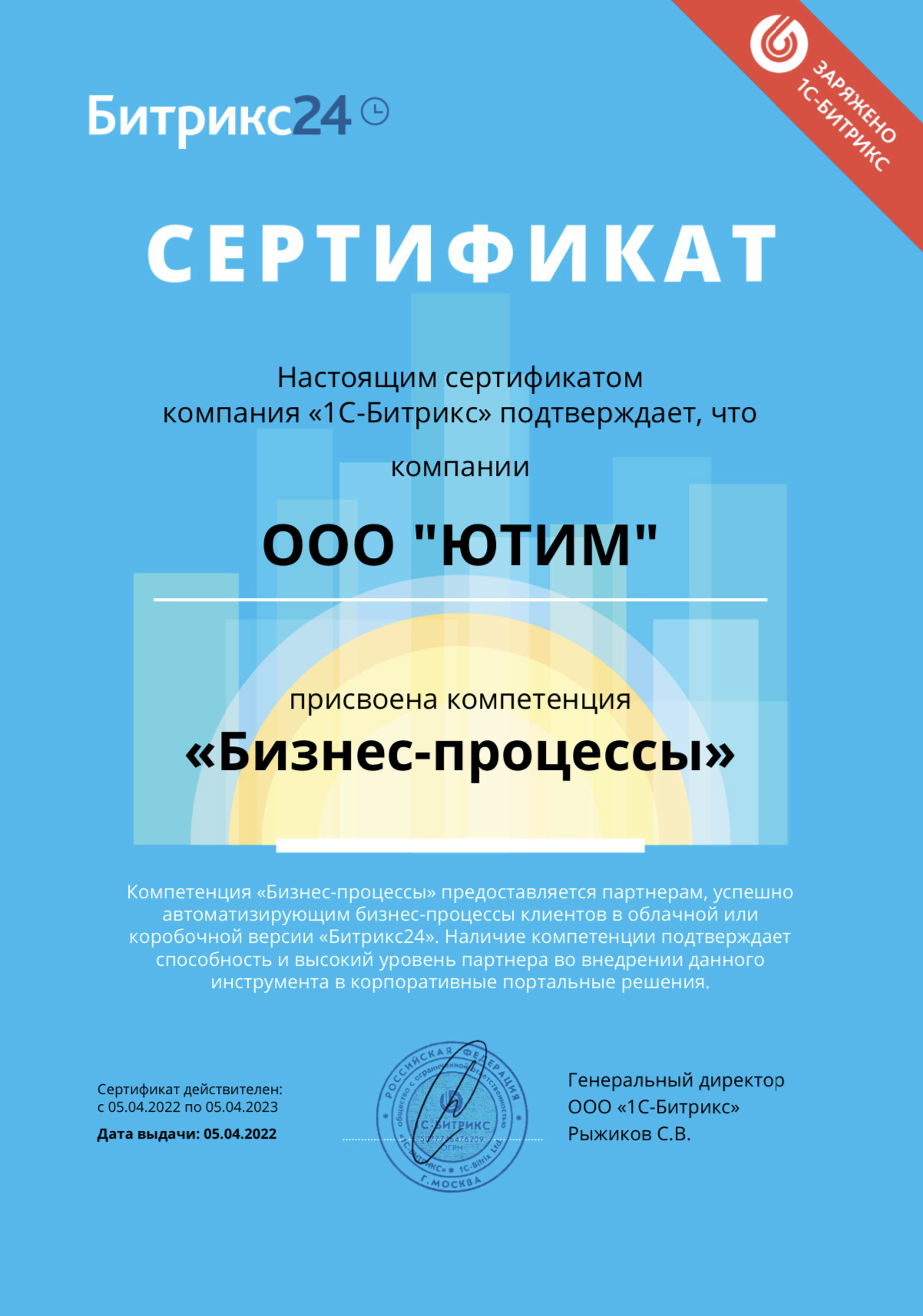 Все специалисты нашей компании, работающие над реализацией и поддержкой проектов, проходят обязательное обучение и тестирование компанией Битрикс24.